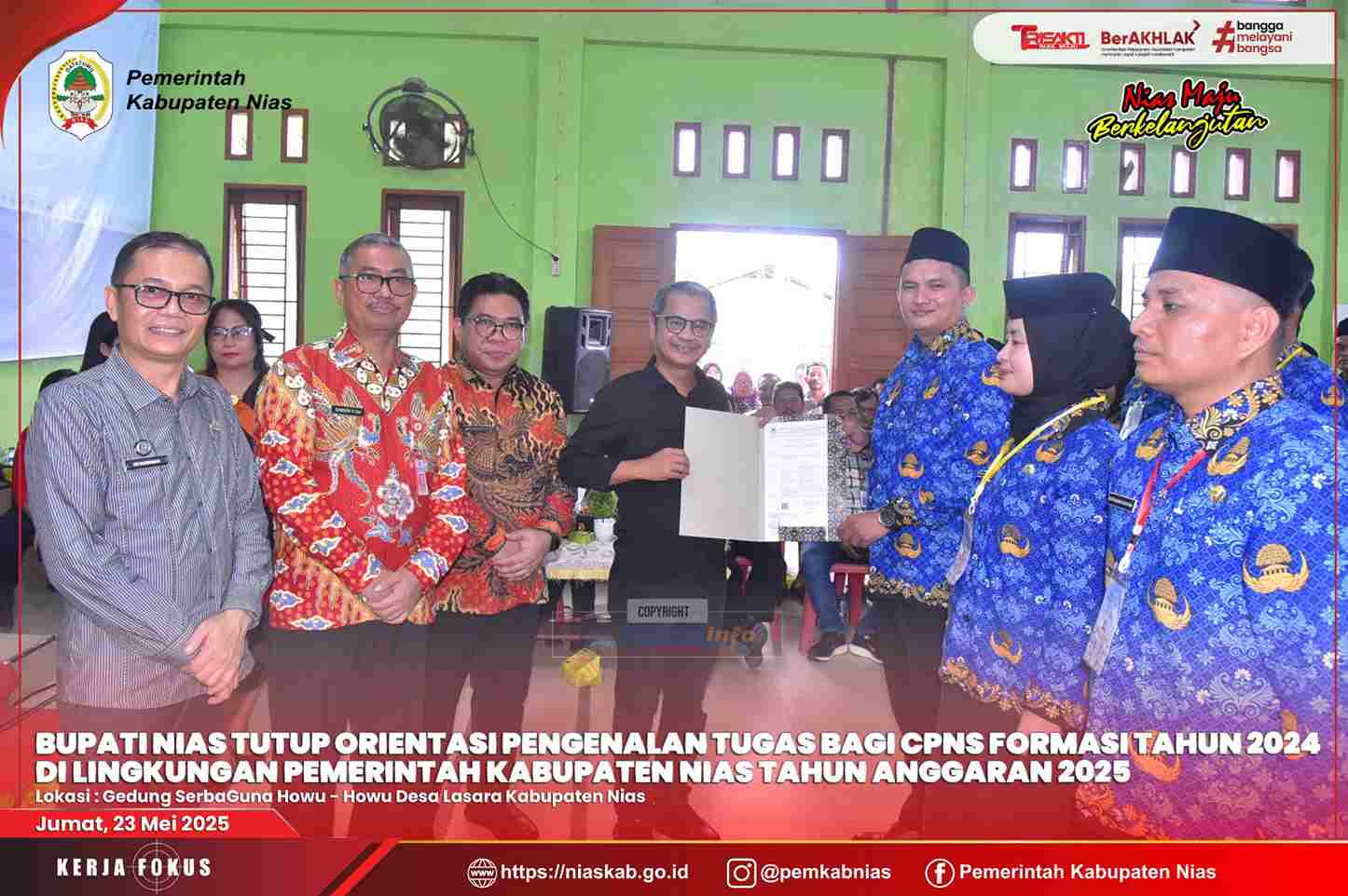 Jumat, 23 Mei 2025. Pemerintah Kabupaten Nias gelar kegiatan Penutupan Orientasi Pengenalan Tugas Bagi CPNS Formasi Tahun 2024 di Lingkungan Pemerintah Kabupaten Nias di Gedung Howu-howu Desa Lasara Kecamatan Gido Kabupaten Nias.